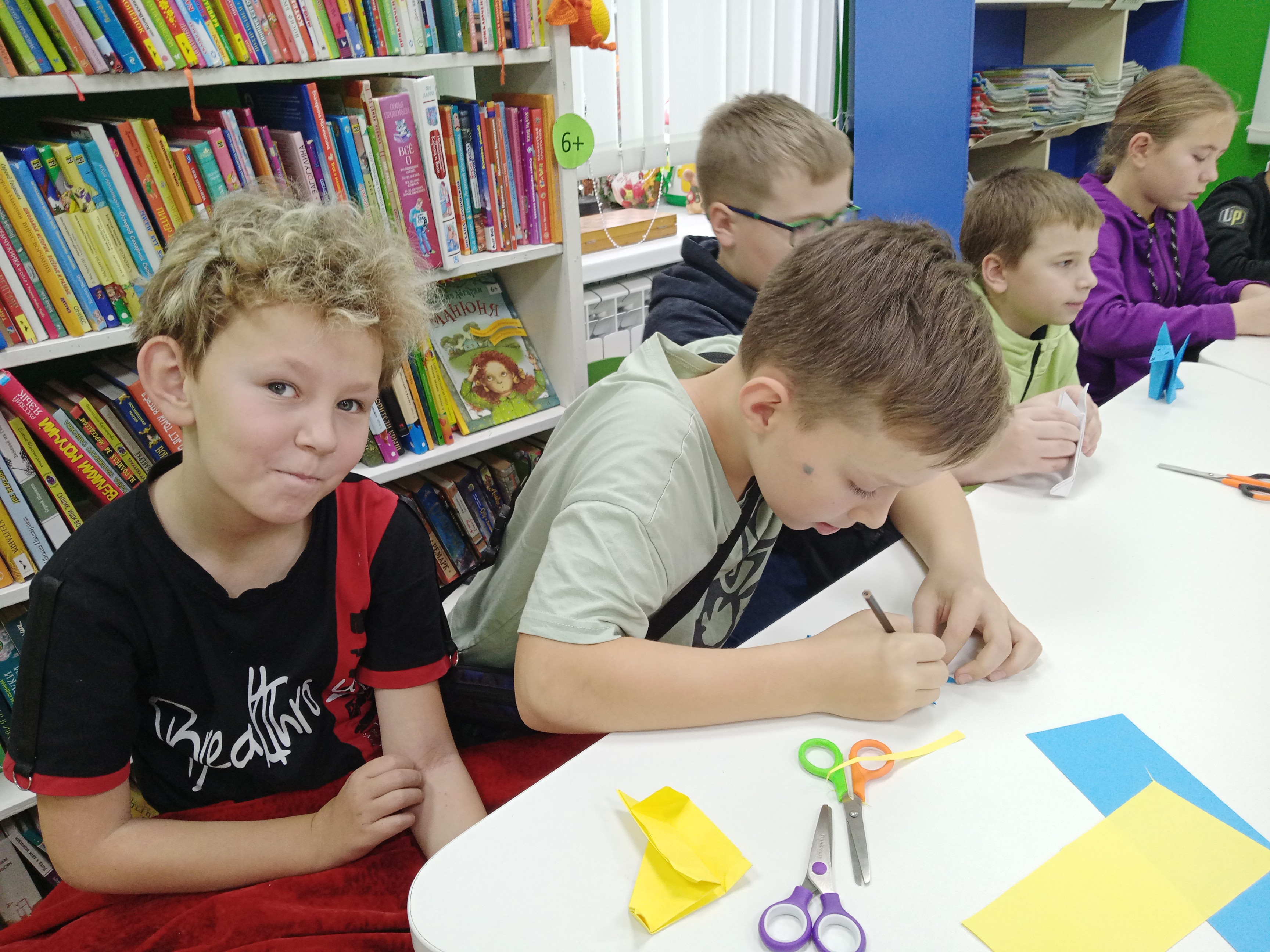 Ребята, посещающие досуговую площадку, пришли в библиотеку на час творчества «Удивительный мир оригами». В течение мероприятия дети узнали об истории праздника, познакомились с книгами по данной теме, а затем отправились в волшебную страну творчества и мастерства. Ребята самостоятельно, последовательно и аккуратно складывали из обычной бумаги симпатичную и забавную лисичку. Также мы с ребятами сделали коллективную работу «Осенний дуб».