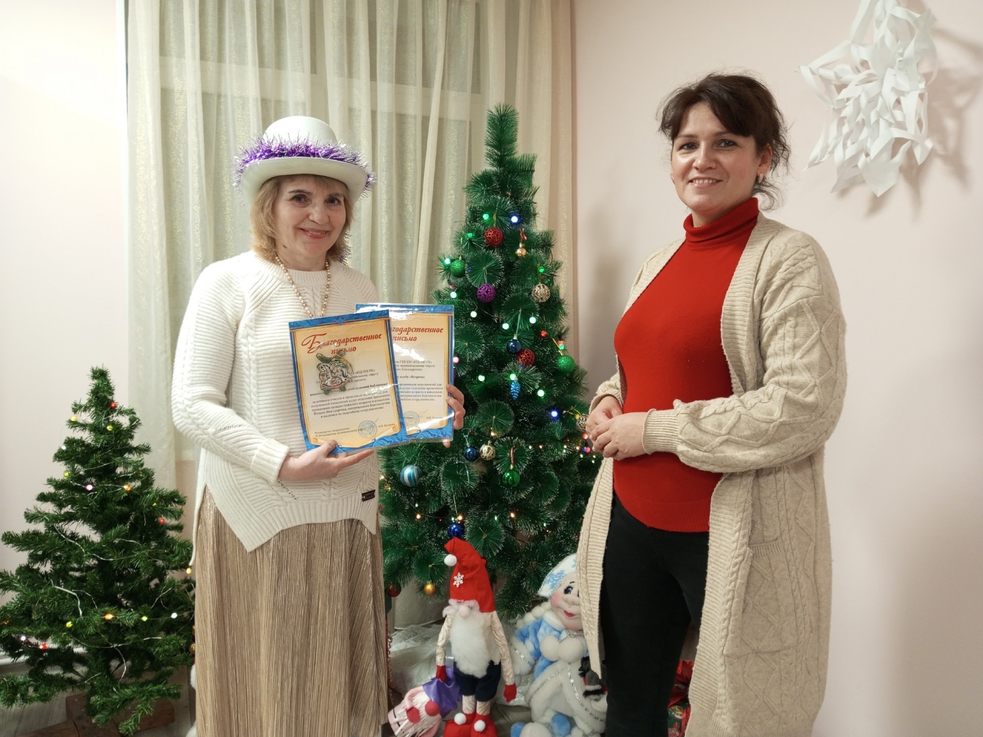 От имени руководства подразделения ГБУ СО «КЦСОН РК» по Беломорскому муниципальному округу культмассовик Людмила Анатольевна Гужиева вручила библиотекарю Вере Григорьевне Ивановой Благодарственные письма сотрудникам библиотеки и женскому клубу «Встреча» за активное участие в проведение мероприятий для получателей социальных услуг отделения временного проживания граждан пожилого возраста и инвалидов и от души поблагодарила за сотрудничество.