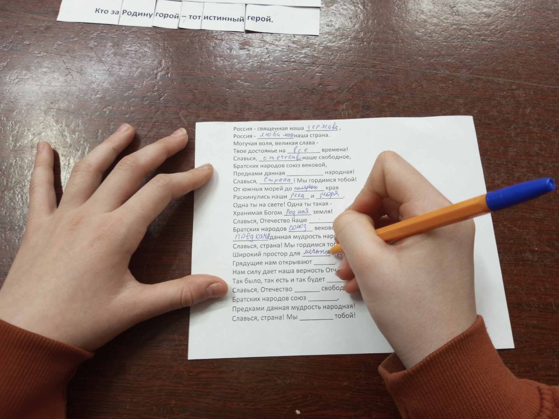 Чтобы проверить свои знания о празднике и истории России, участники мероприятия выполнили различные задания. Ответили на вопросы викторины, собирали пословицы, отгадывали загадки, в заключение игры вставили пропущенные слова в Гимн Российской Федерации и дружно исполнили его.