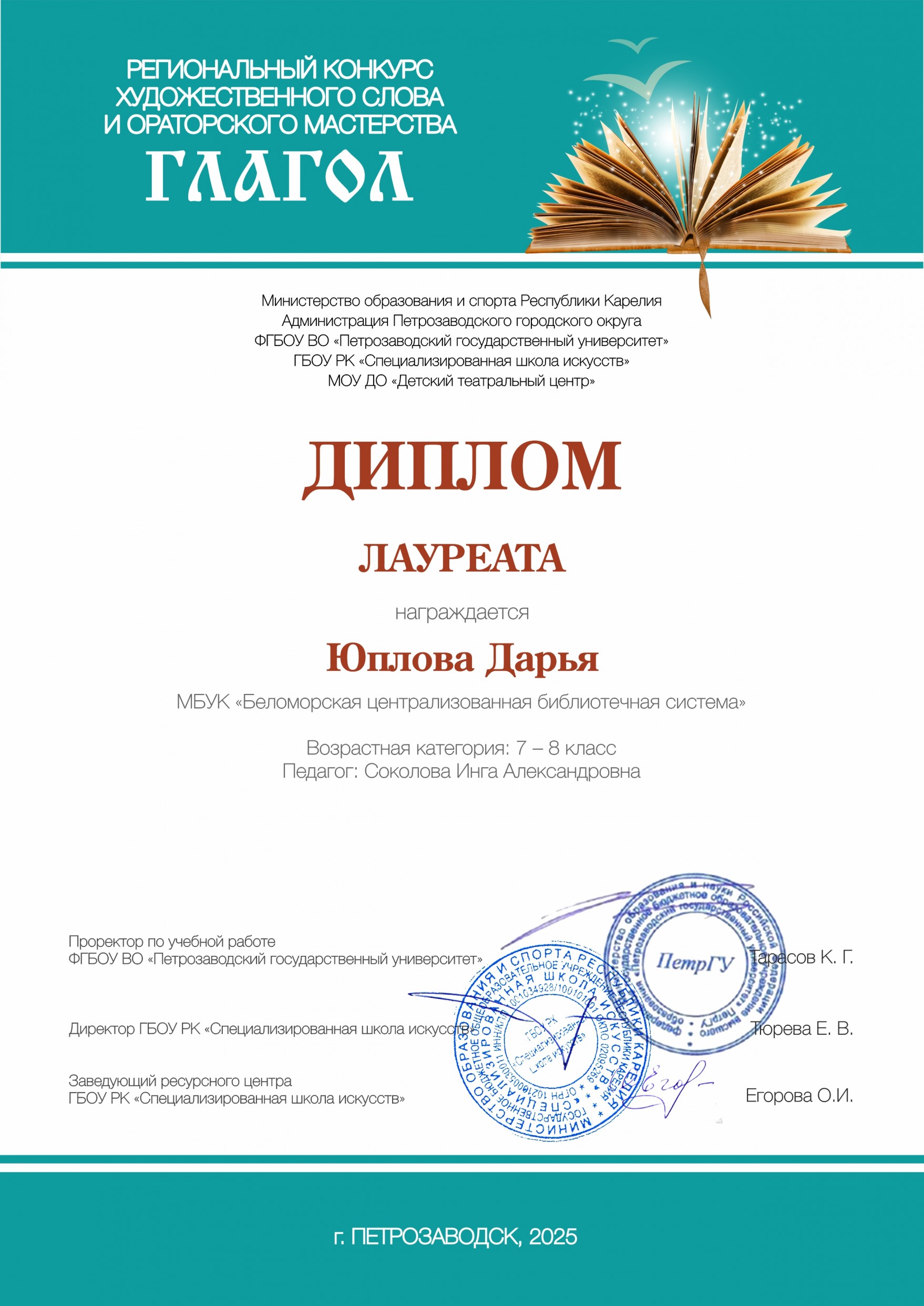 Беломорская центральная модельная библиотека с гордостью отмечает вклад в успешное выступление ученицы СОШ №1 Дарьи Юпловой. Подготовкой юной участницы к конкурсу художественного слова занималась библиотекарь Инга Соколова.