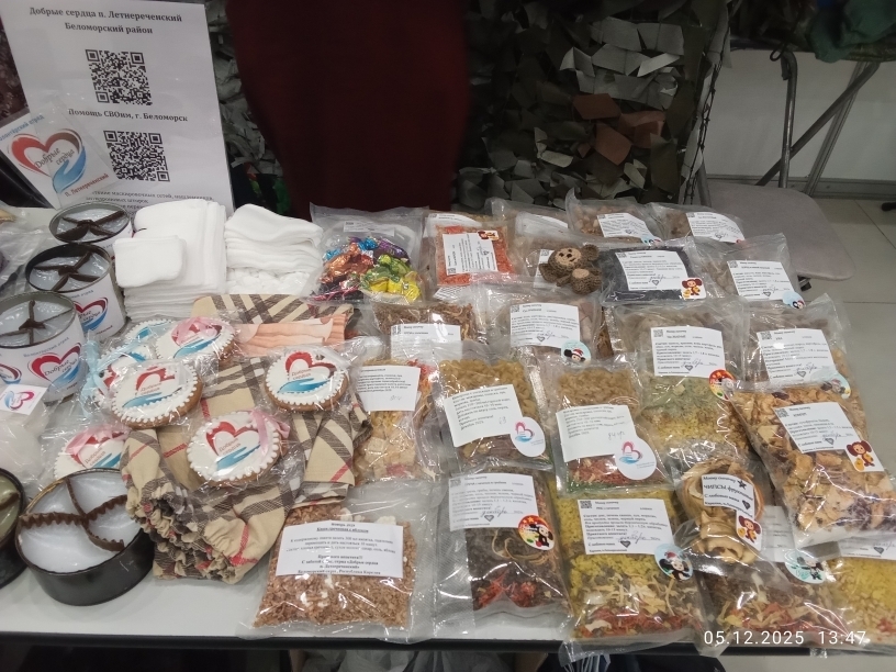 Беломорский муниципальный округ презентовал свои изделия для бойцов на передовой – маскировочные сети, сублимированная еда, окопные свечи, перевязки для госпиталей и многое другое. В их числе маскировочная сеть «Карельская кикимора», изготовленная волонтёрами Золотецкой сельской библиотеки.